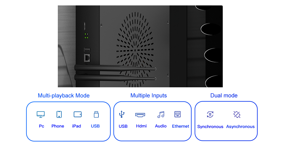 USB、HDMI、Wi-Fi、PC、手機、iPad 等均可連接操控。即插即用,提供揚聲器。